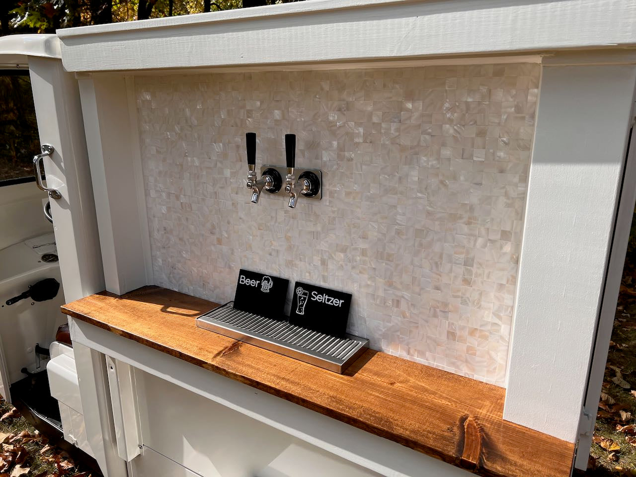 It is equipped with a two-tap system to hold your favorite brews, kegged cocktails, kombucha, wine, or non-alcoholic kegged cocktails like soda and root beer, as well as non-carbonated beverages like cold brew coffee, apple cider, and more. This self-serve mobile bar is outfitted with a power-free drink cooling system. We supply you with our coordinated drink signs. You'll supply the drinks of your choice. We cannot provide the alcohol due to licensing and insurance regulations.